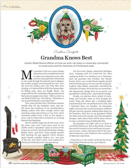 I was honored to be asked by Country Living — one of my favorite magazines — to write a Christmas essay for their December/January holiday issue. My essay, Grandma Knows Best, is about how our beloved pets keep us connected to loved ones and the memories of Christmases past. It is featured on the final page of the magazine and was a joy to write. If your beloved pets — whether with you now or just in your memory — have been a special part of your holiday celebrations over the years, I hope this essay touches your heart. (And check out our new holiday gift line that features Gerti-inspired presents for the dog lover in your life! Santa approved!)