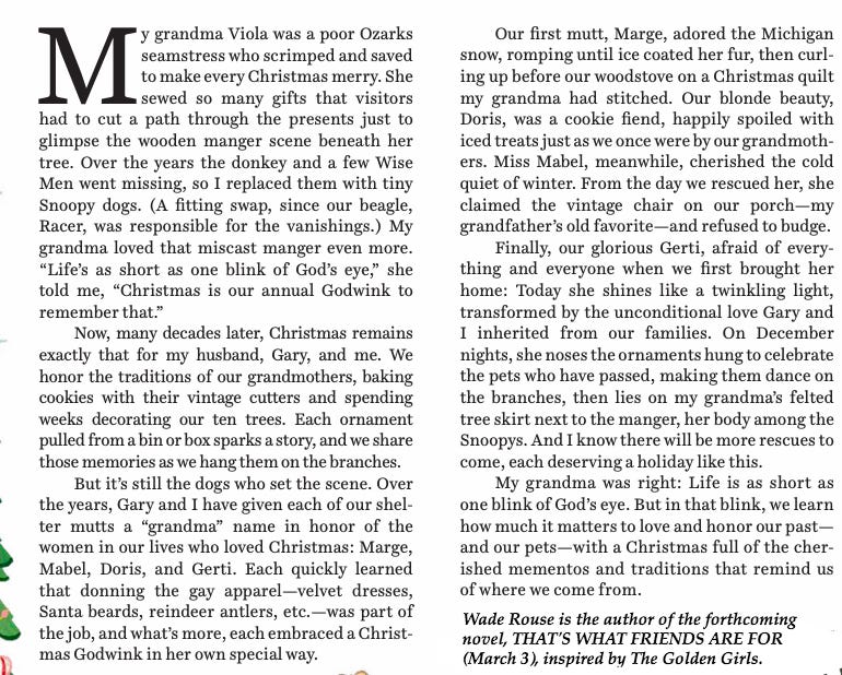 Christmas has always been one of my favorite holidays. My grandma, Viola Shipman, instilled the meaning and magic of Christmas from the earliest of ages (as you can see in that first picture!). Though our parents and grandparents may be gone, Gary and I continue to bring their lives and light — as well as the beauty of the holidays — to life through the traditions, decorating, recipes and faith they taught us. We decorate 11 trees (yes, 11!), we bake cookies, we watch movies, we make Clark Griswold look completely normal. In my next Substack — in advance of Christmas — I will take you on a “holiday stroll” through our home and decorations (trees, tinsel tree villages, snow globe collections, felted tree skirts, manger scenes and thousands of heirloom ornaments) as well as a beloved holiday recipe. And if you’d like to join us LIVE for our holiday home stroll, Christmas craft day and holiday party, please follow me HERE ON FACEBOOK for photos and WINE & WORDS WITH WADE every Thursday at 6:30 p.m. ET. In the meantime, I wrote a special holiday essay (below) that I hope reminds you to embrace the spirit of the season!