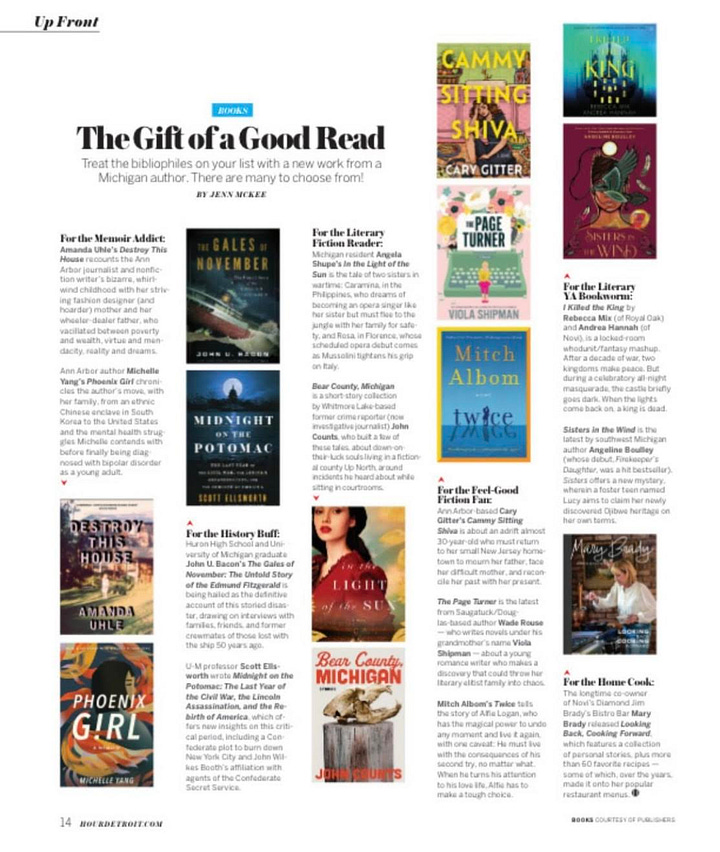 And Hour Detroit named THE PAGE TURNER as part of their annual Book Gift Guide of Michigan Authors for The Feel-Good Fiction Fan! They wrote: “By Wade Rouse (writing under Viola Shipman), Saugatuck/Douglas-based. Follows a young romance writer who makes a discovery that could throw her literary elitist family into chaos!”